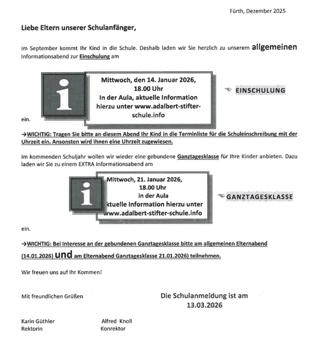 >WICHTIG: Bei Interesse an der gebundenen Ganztagesklasse bitte am allgemeinen Elternabend und am Elternabend Ganztagesklasse teilnehmen!